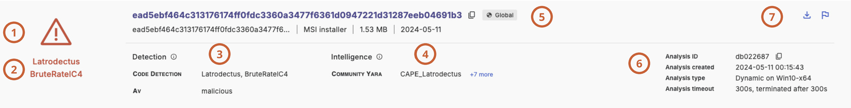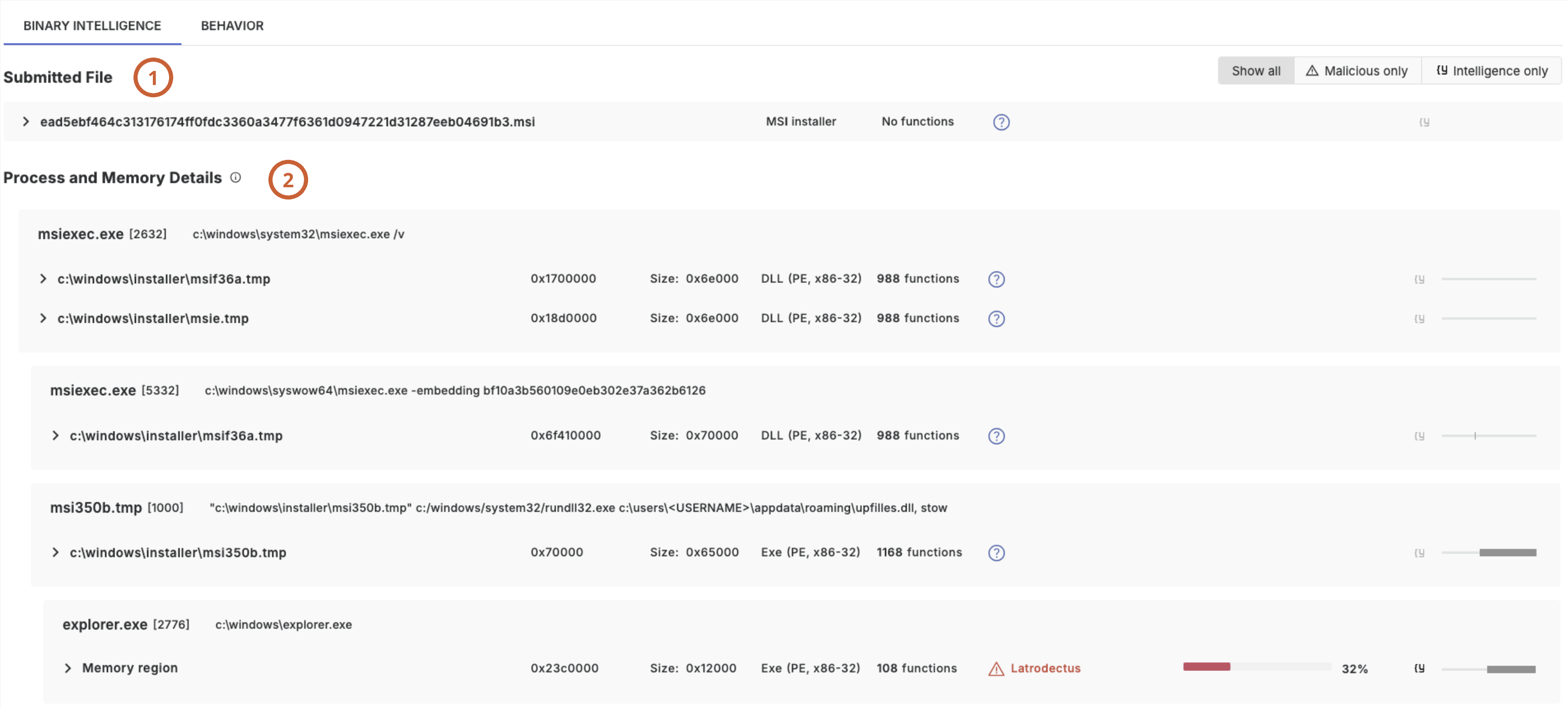 It contains the analysis for the submitted file (1) and the analysis of all memory regions that contain binary code (2). A memory region has either been extracted through dynamic analysis, or extracted statically in case the analysis is from a minidump or an endpoint scan.