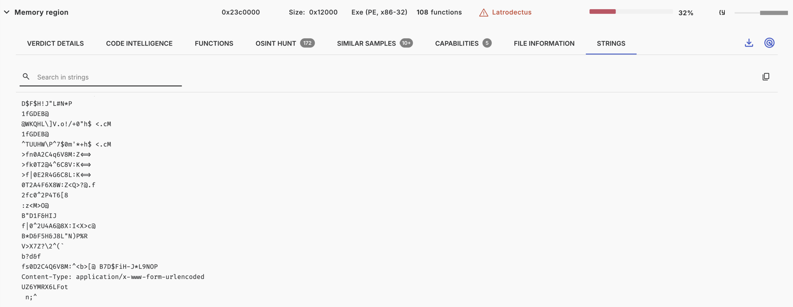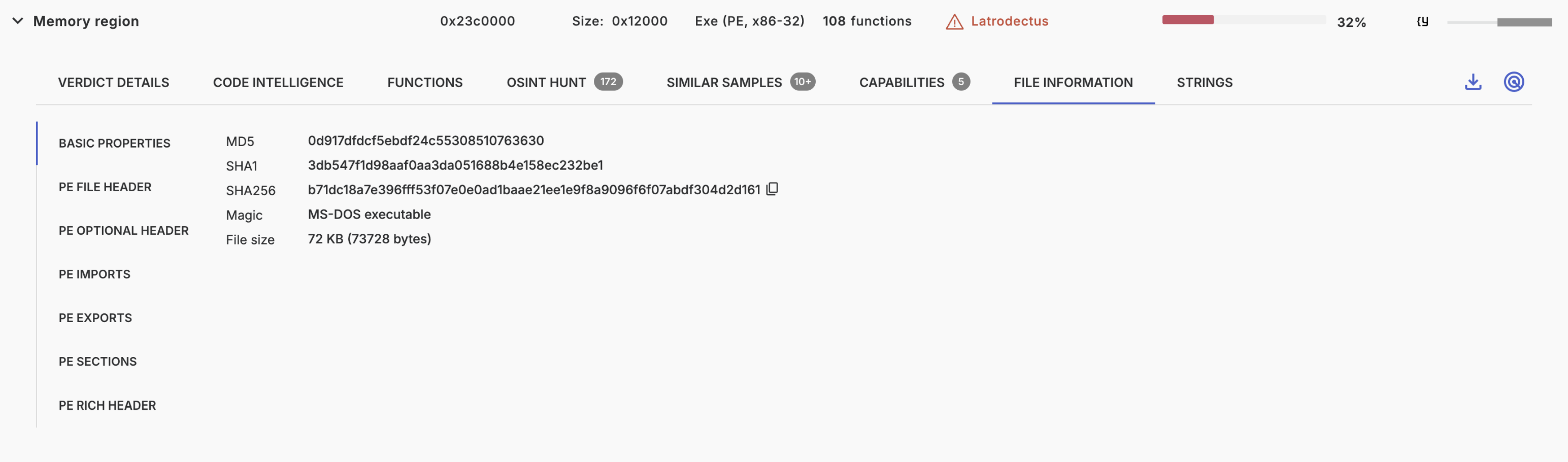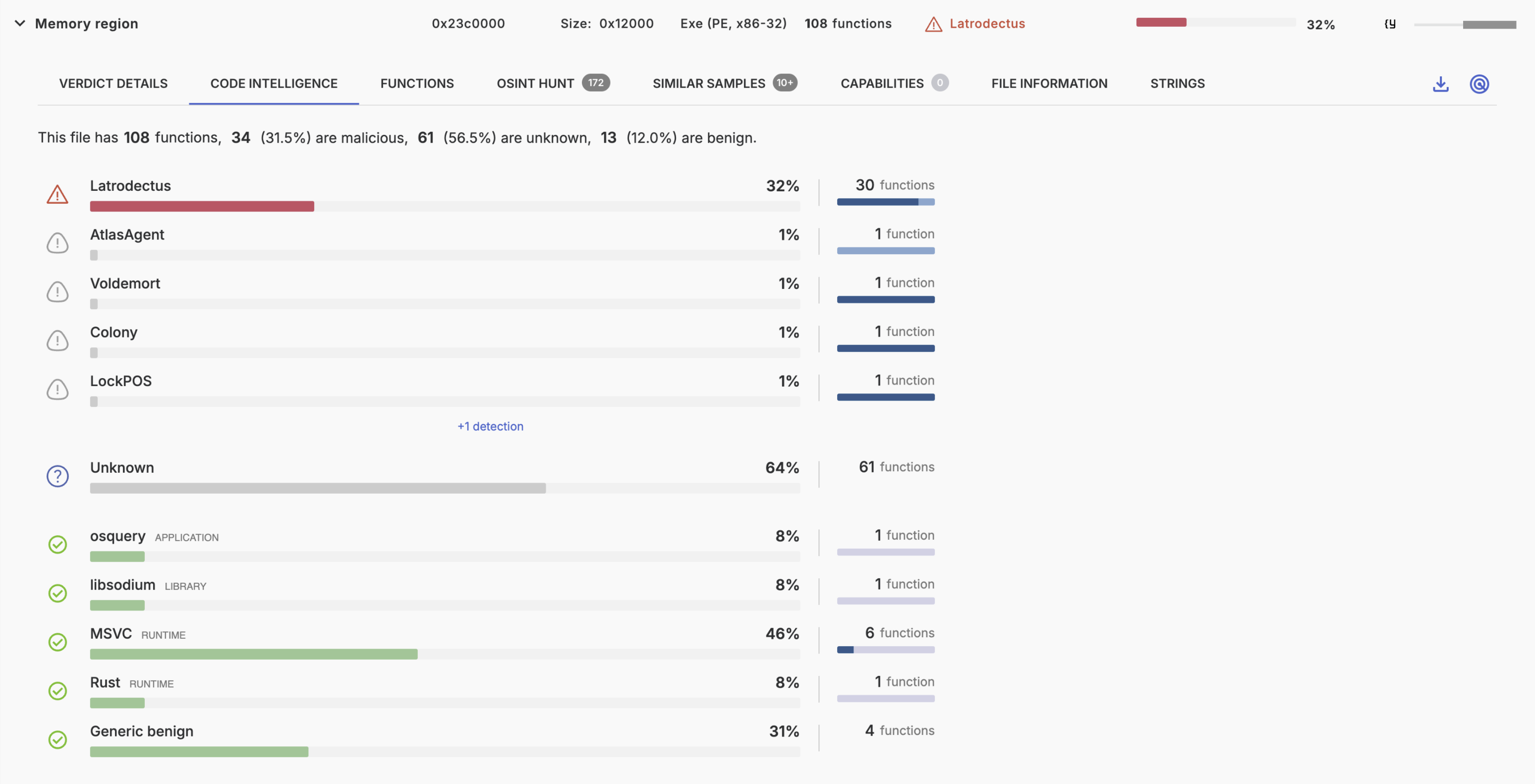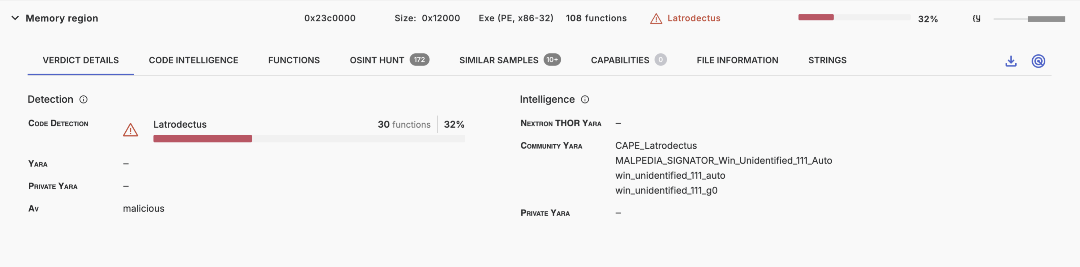 In this example, we are looking at the details of a memory region, extracted from the explorer.exe process and identified as Latrodectus. There are several tabs: verdict details, code intelligence, functions, OSINT hunt, capabilities, file information and strings.