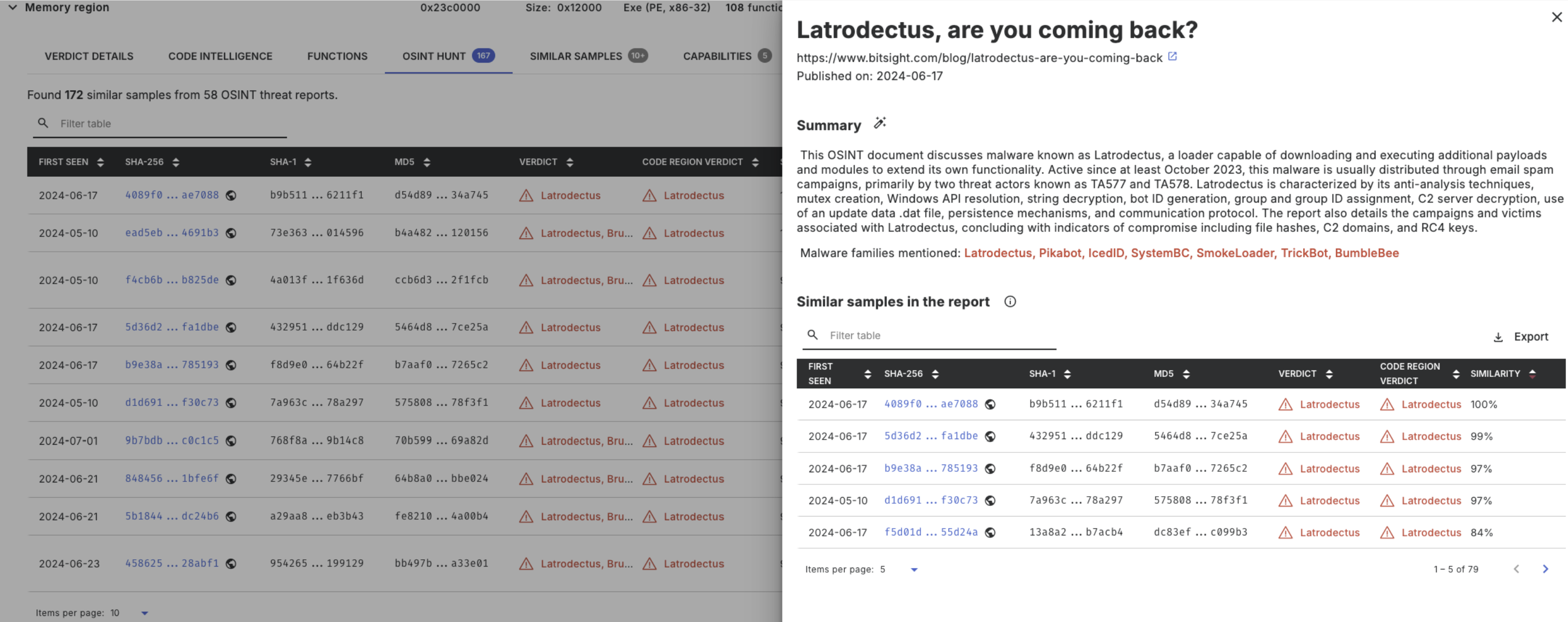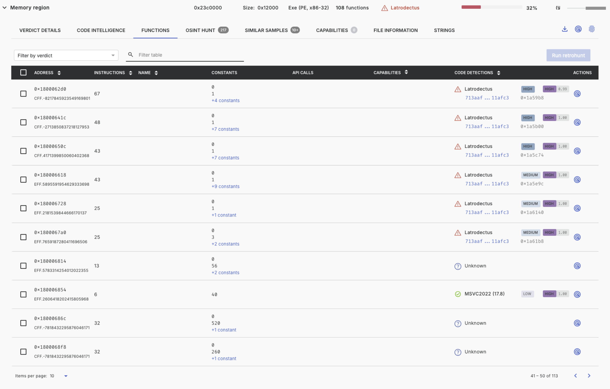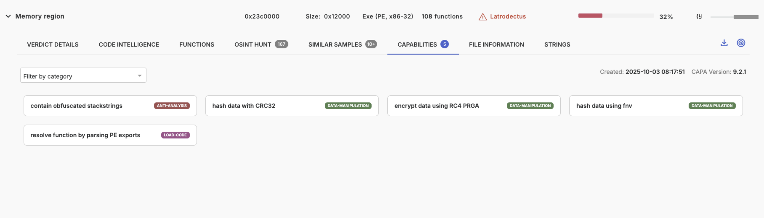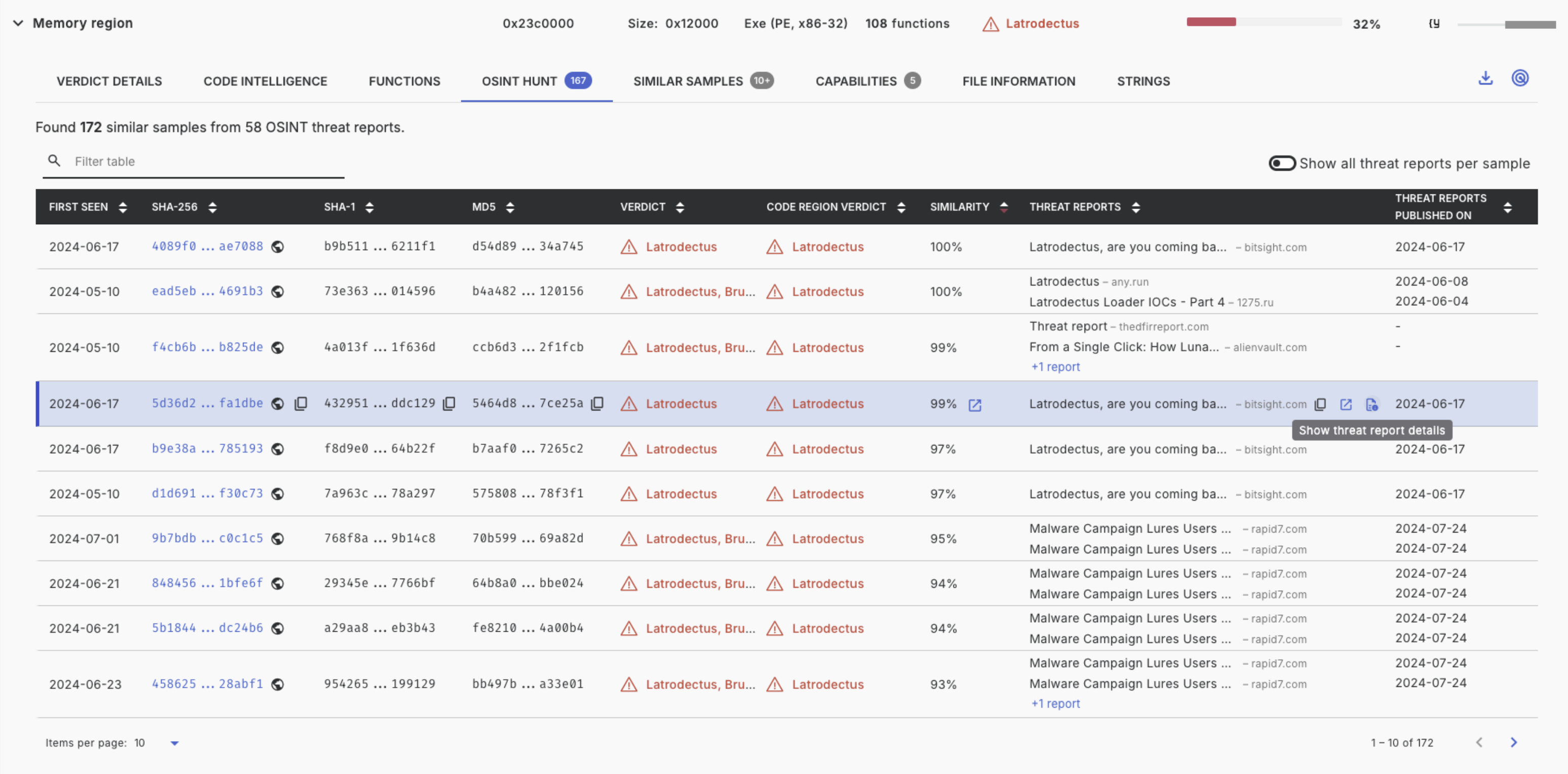 In this example, we are looking at the details of a memory region, extracted from the explorer.exe process and identified as Latrodectus. There are several tabs: verdict details, code intelligence, functions, OSINT hunt, capabilities, file information and strings.
