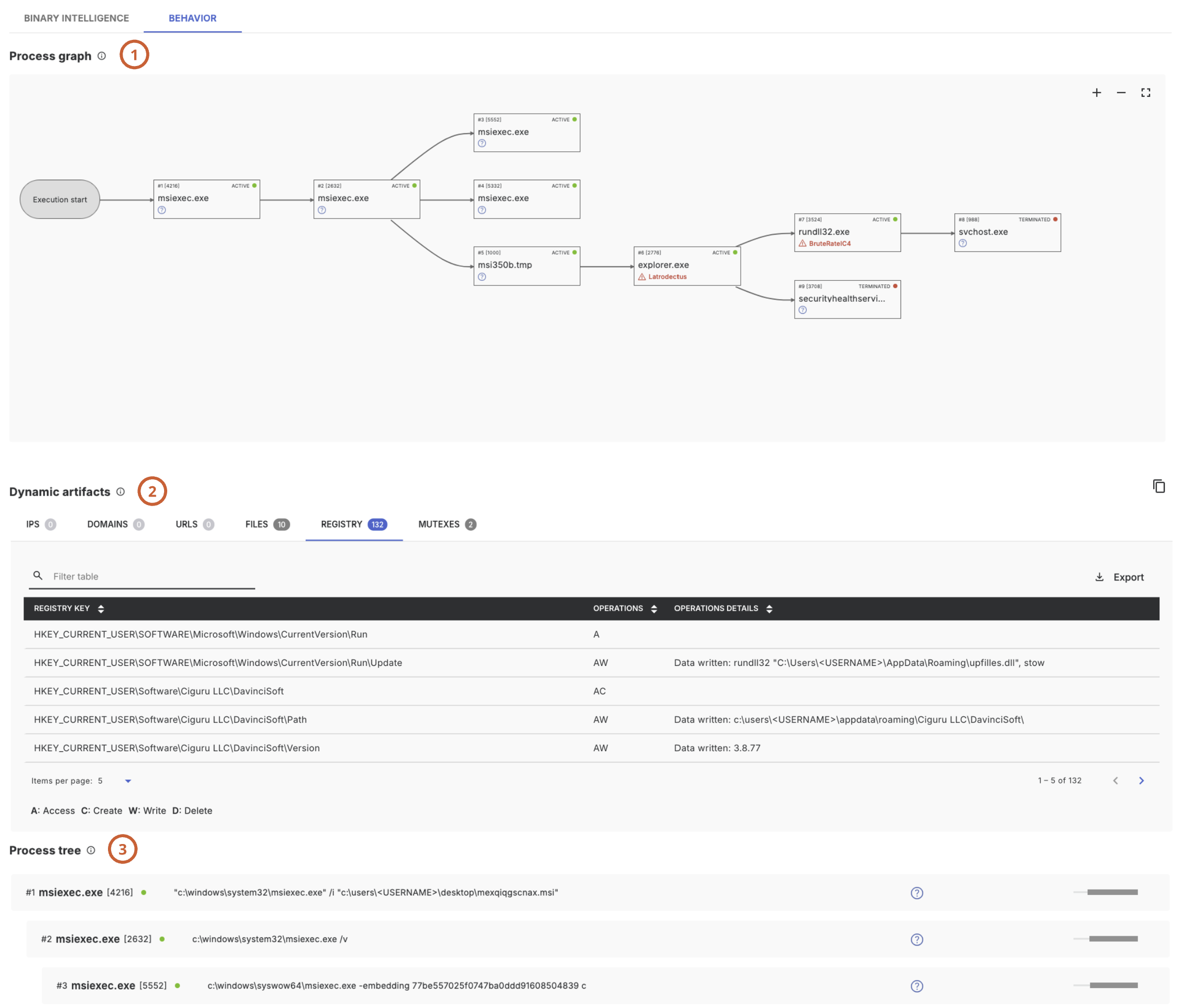 The behavior section contains information from our sandboxing component, such as the process graph (1), dynamic artifacts (2), as well as the process tree (3).