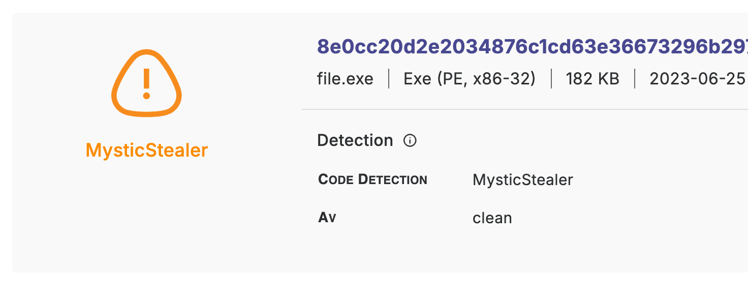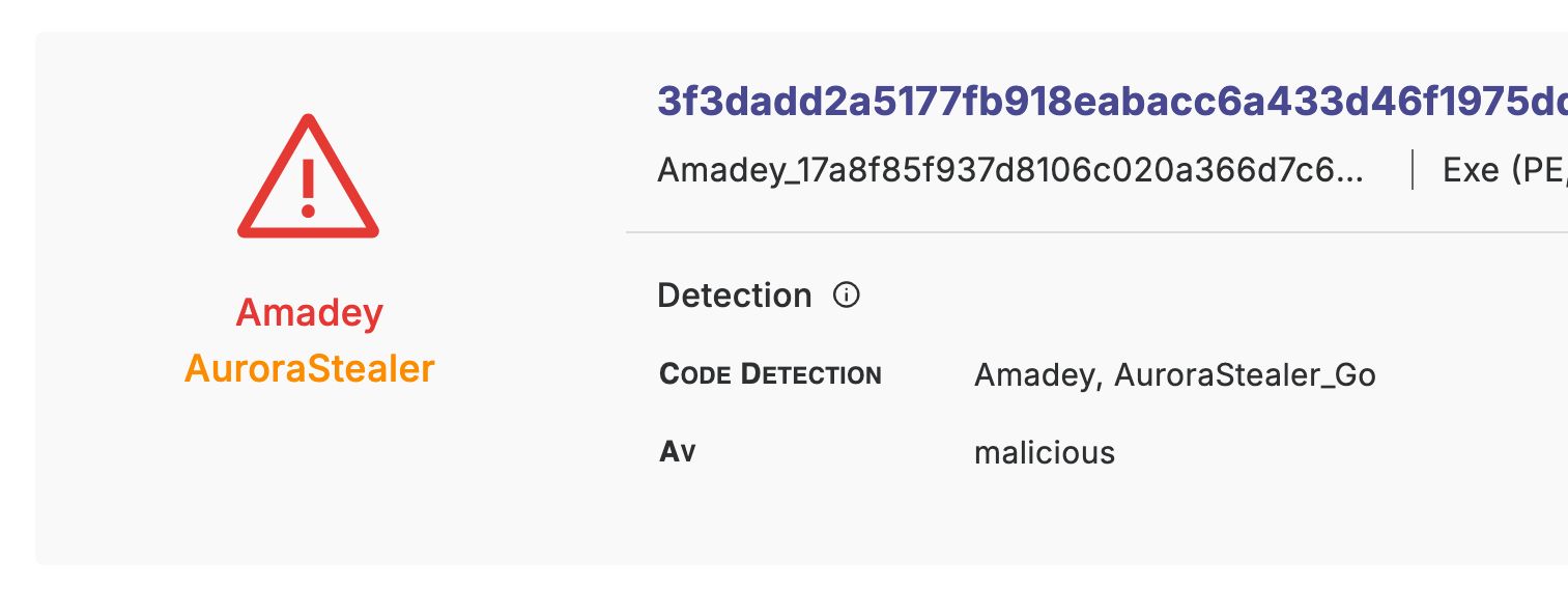 The identification part of a verdict includes one or multiple malware family names. For example, in this instances, such as “Amadey” and “AuroraStealer_Go” in this example: