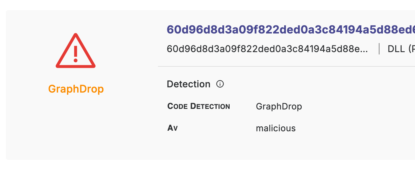 In the example below, we show a high confidence maliciousness (red triangle) and medium confidence attribution to the “GraphDrop” family (orange font):
