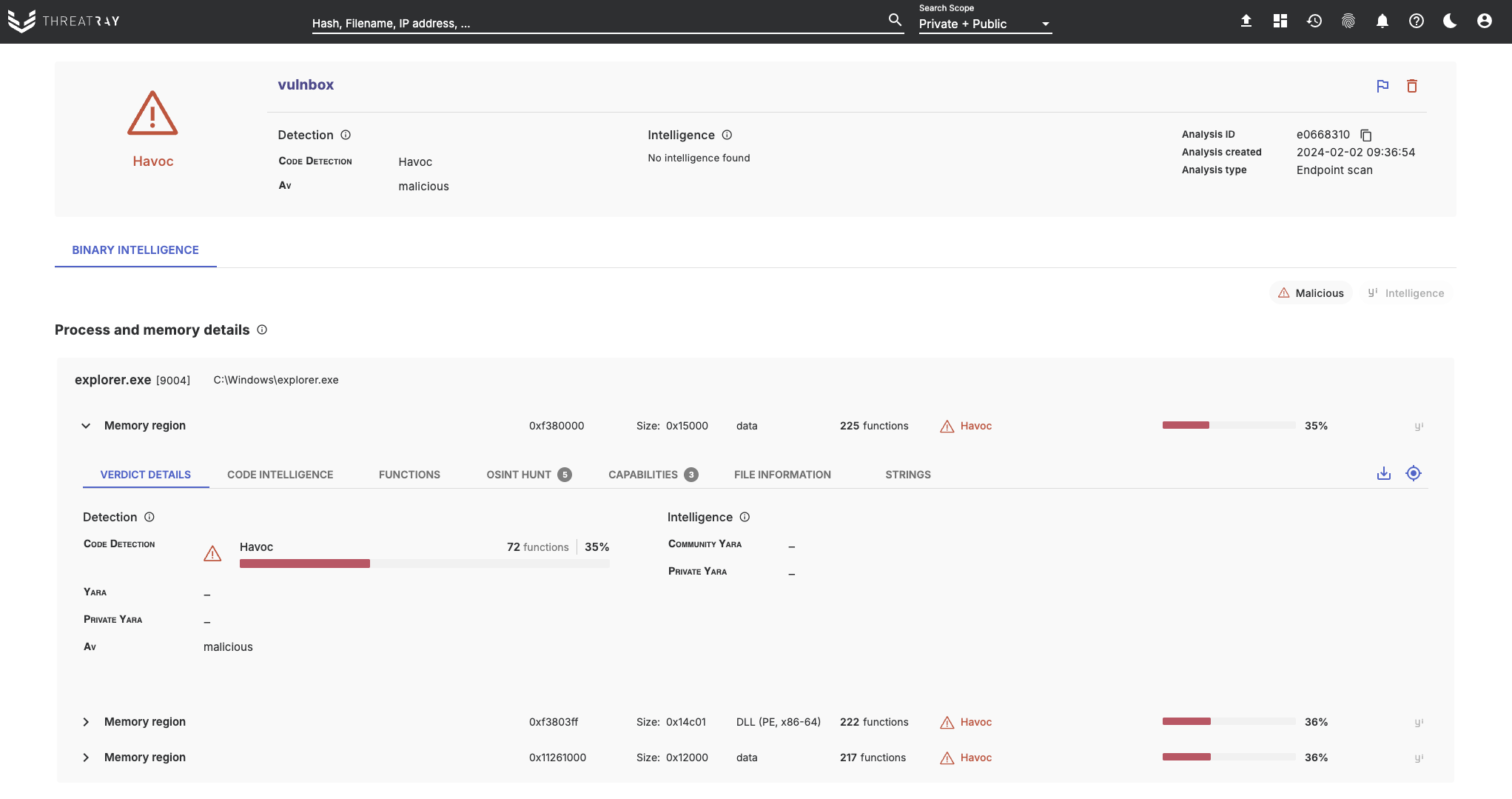 Each scan completes within minutes on the endpoint, automatically uploading collected memory dumps to your private Threatray instance for analysis, where results will be available shortly after the scan. Only memory containing code is gathered and analyzed, no full memory dumps or non-executable data that might contain privacy-sensitive information is collected.