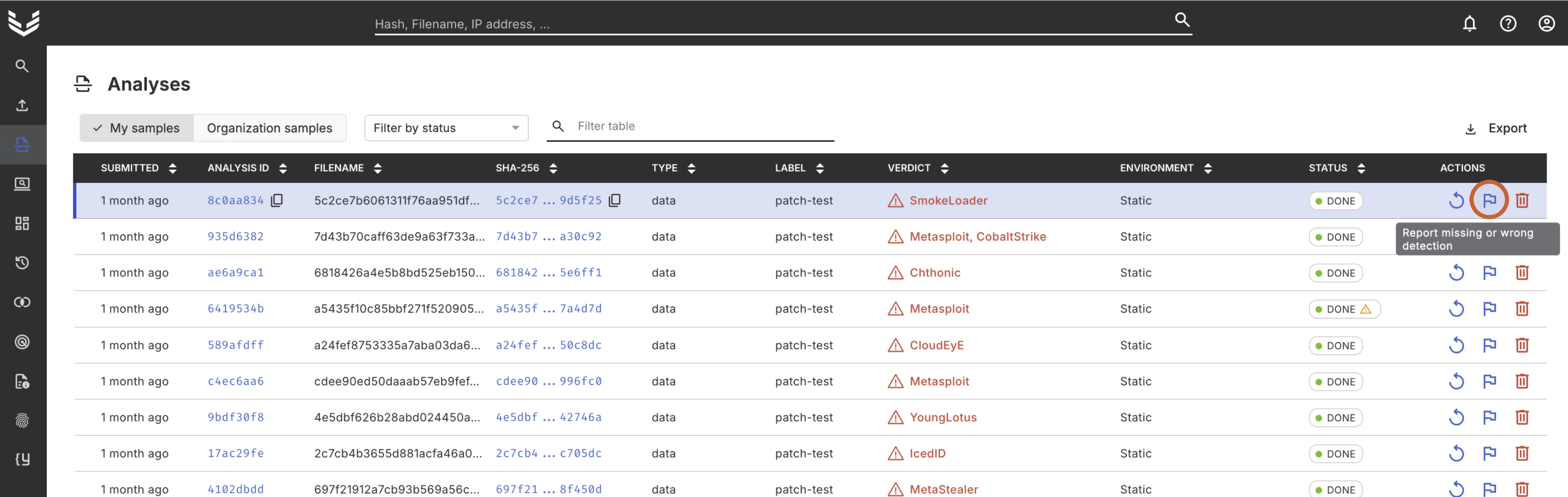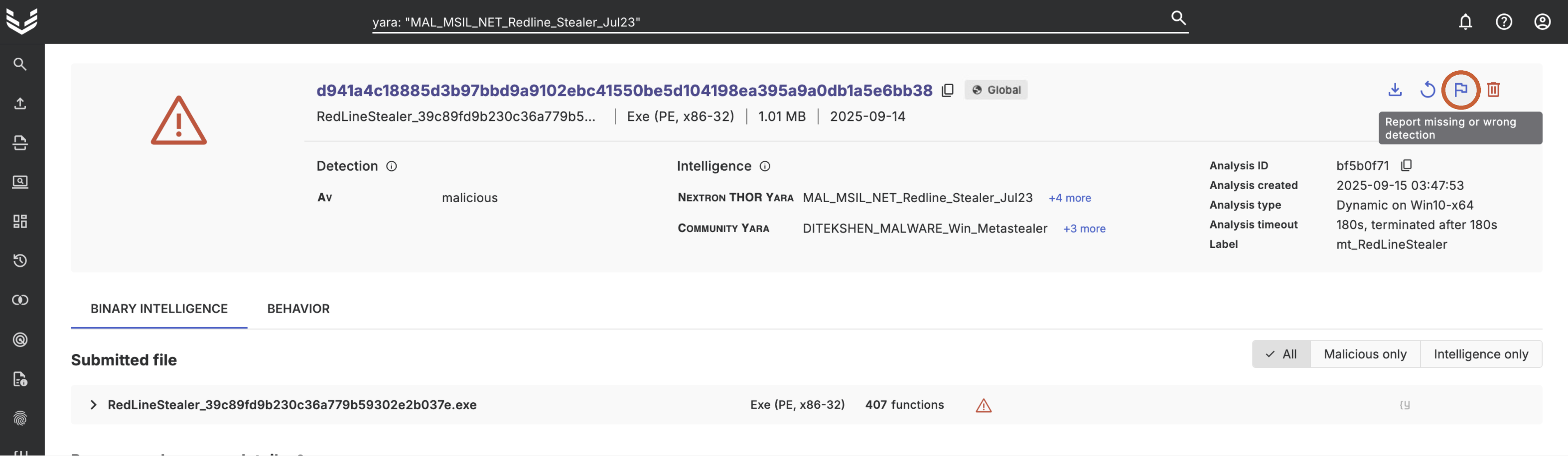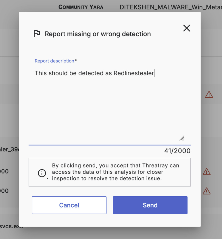 If you come across a detection that seems to be a false positive or expected the identification of a specific family by Threatray that isn’t detected, you have the option to notify our threat intelligence team to resolve the matter. They are dedicated to examining these cases thoroughly to rectify any issues and address any other inquiries promptly.