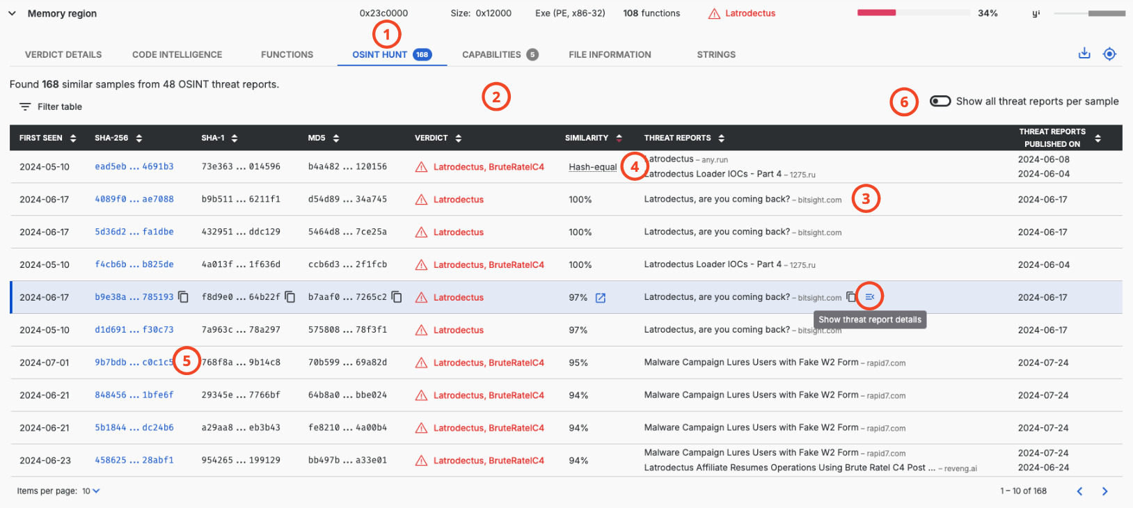 OSINT Hunt is available for any piece of binary code, such as a submitted file or memory region, via a dedicated tab (1).