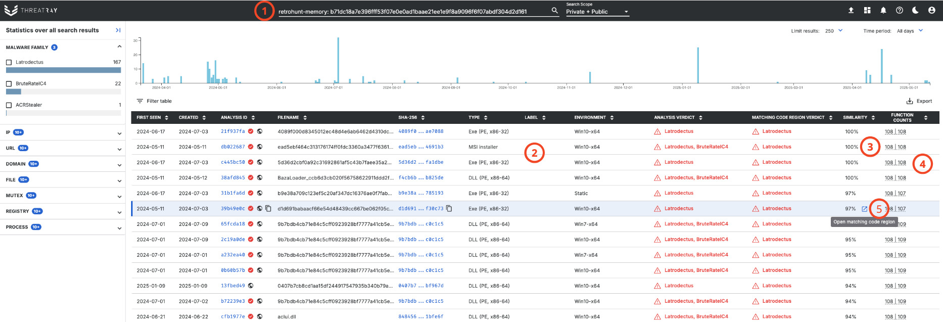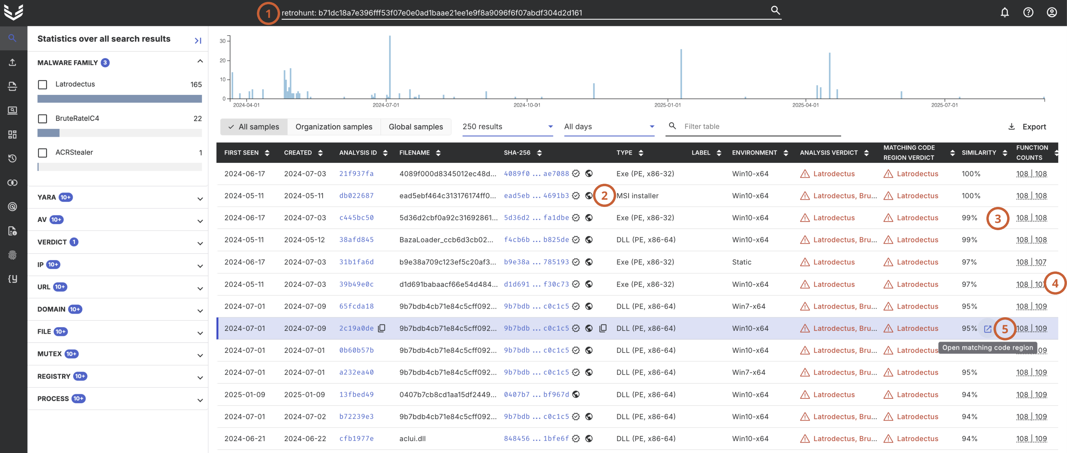 Once a Retrohunt is launched, a search query (1) is issued. The search syntax and view results are explained here. The hash in the query serves as the selector for the code underlying the binary file with this hash.