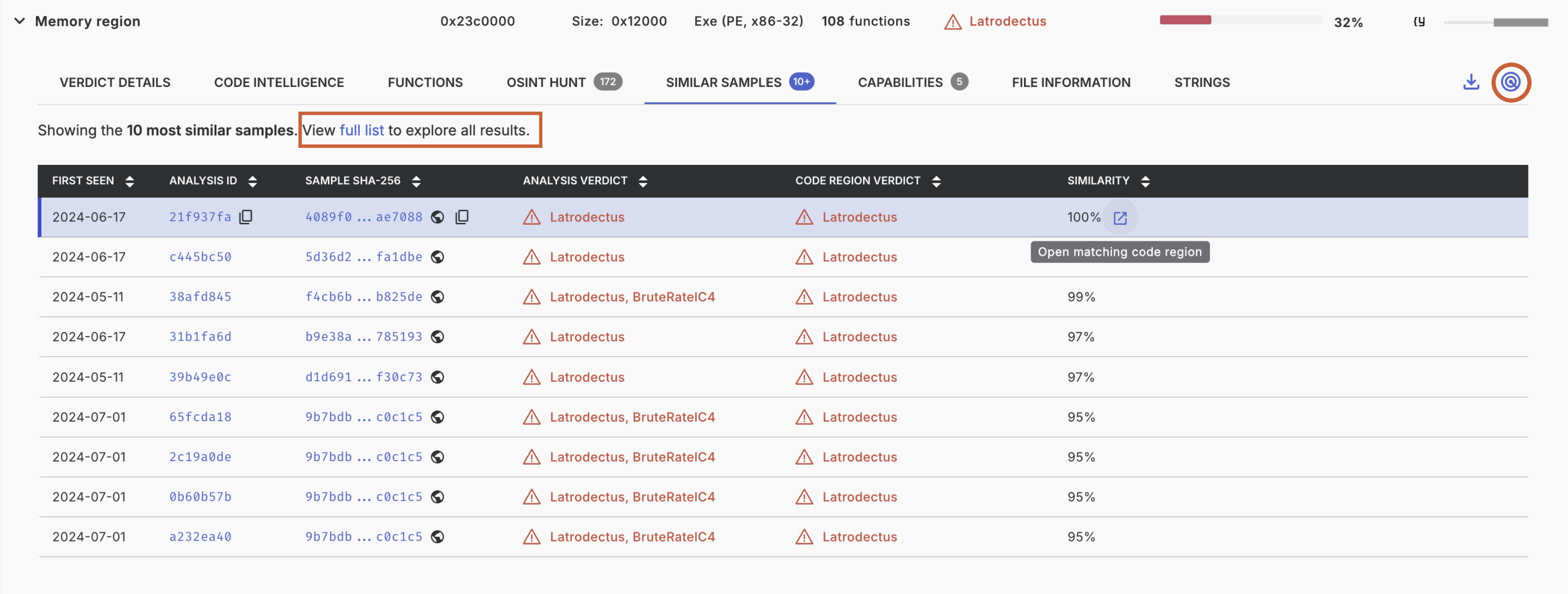 Retrohunt can find code-wise similar samples of malware with a single click within seconds. This unique capability significantly improves upon the traditional YARA-based approach for retrohunting, which requires more skills and time and is generally less effective at finding malware versions.