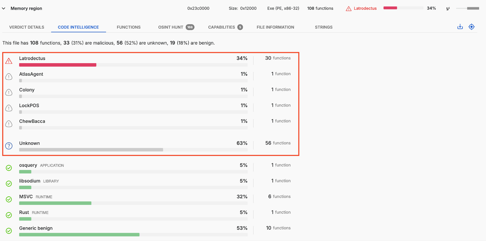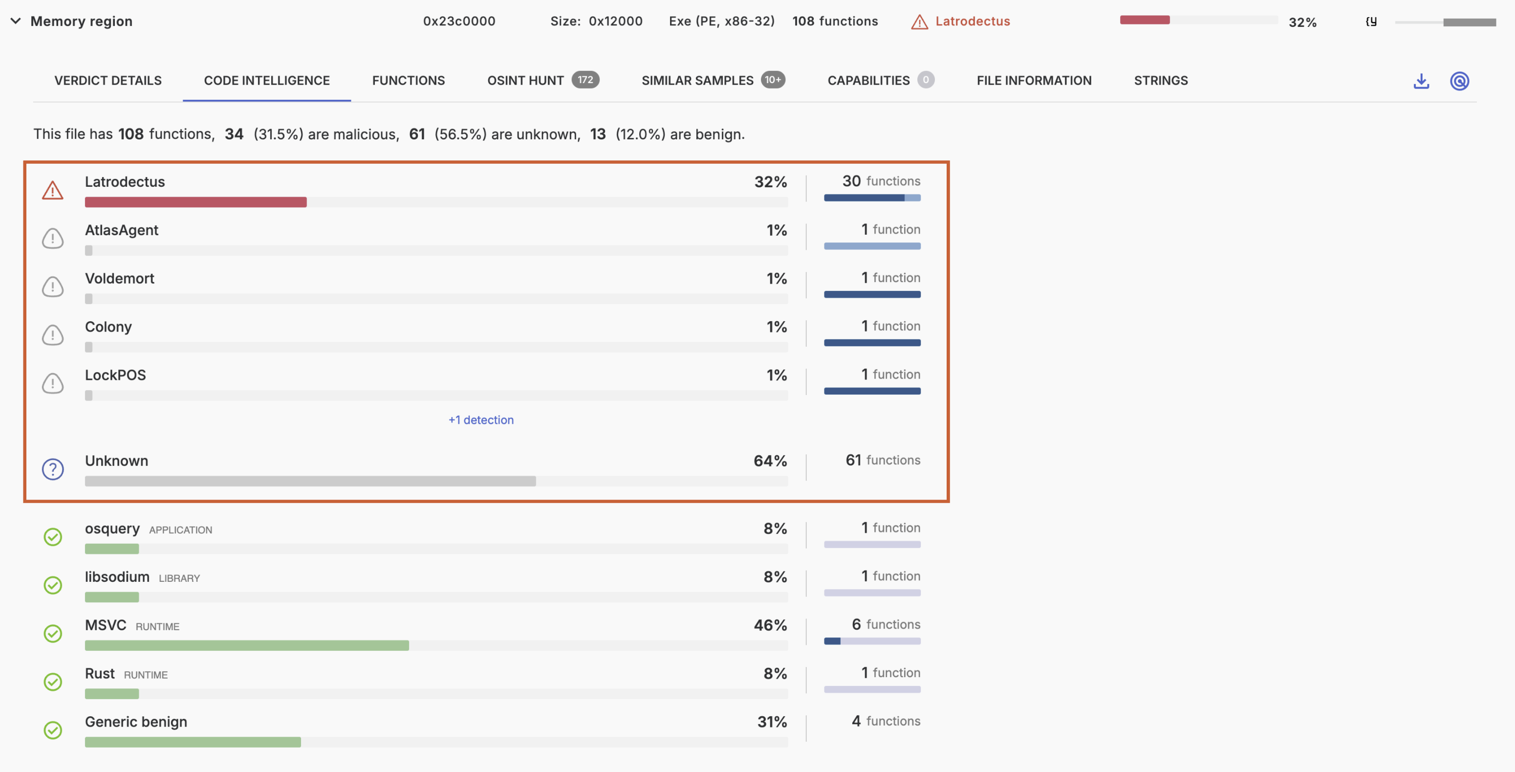 Each Retrohunt searches for similar samples based on all functions in the binary, excluding benign functions. This prevents finding similar samples based on legitimately shared code, such as compiler code or benign third-party libraries.