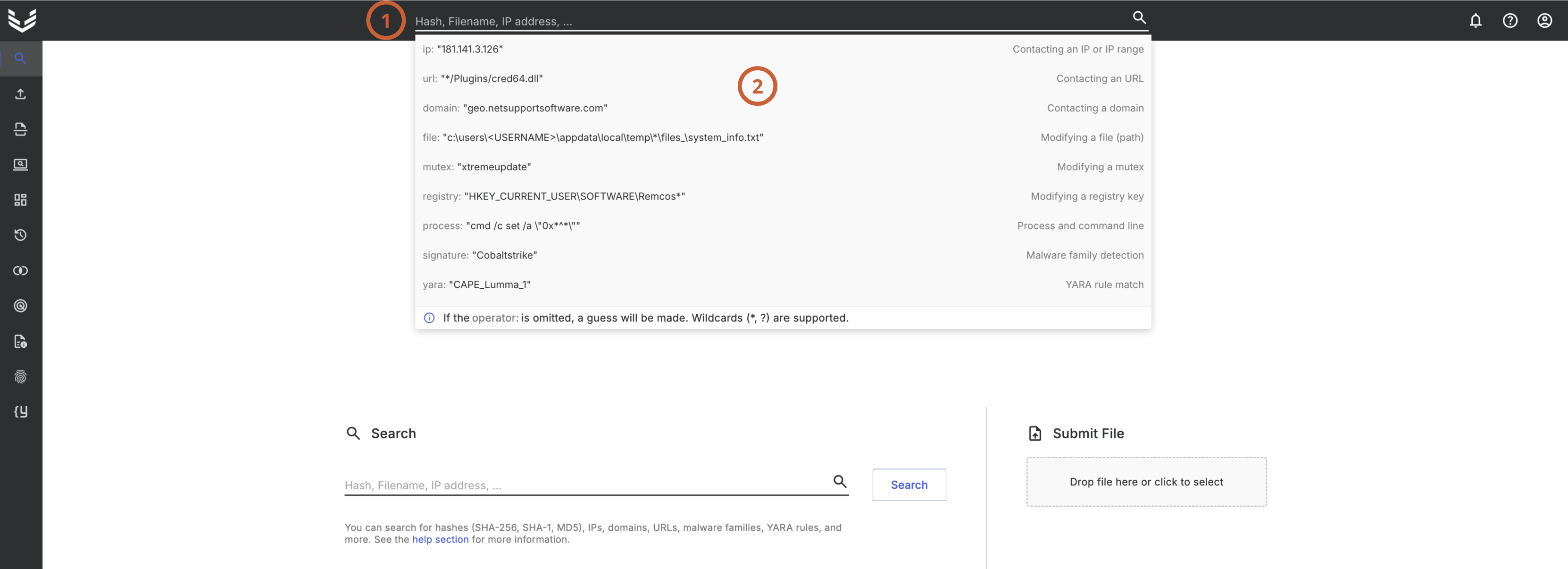 If an ‘operator:’ is omitted, the system attempts to deduce the type of search based on the input (e.g., ‘hash:’ for hashes, ‘ip:’ for IPs).