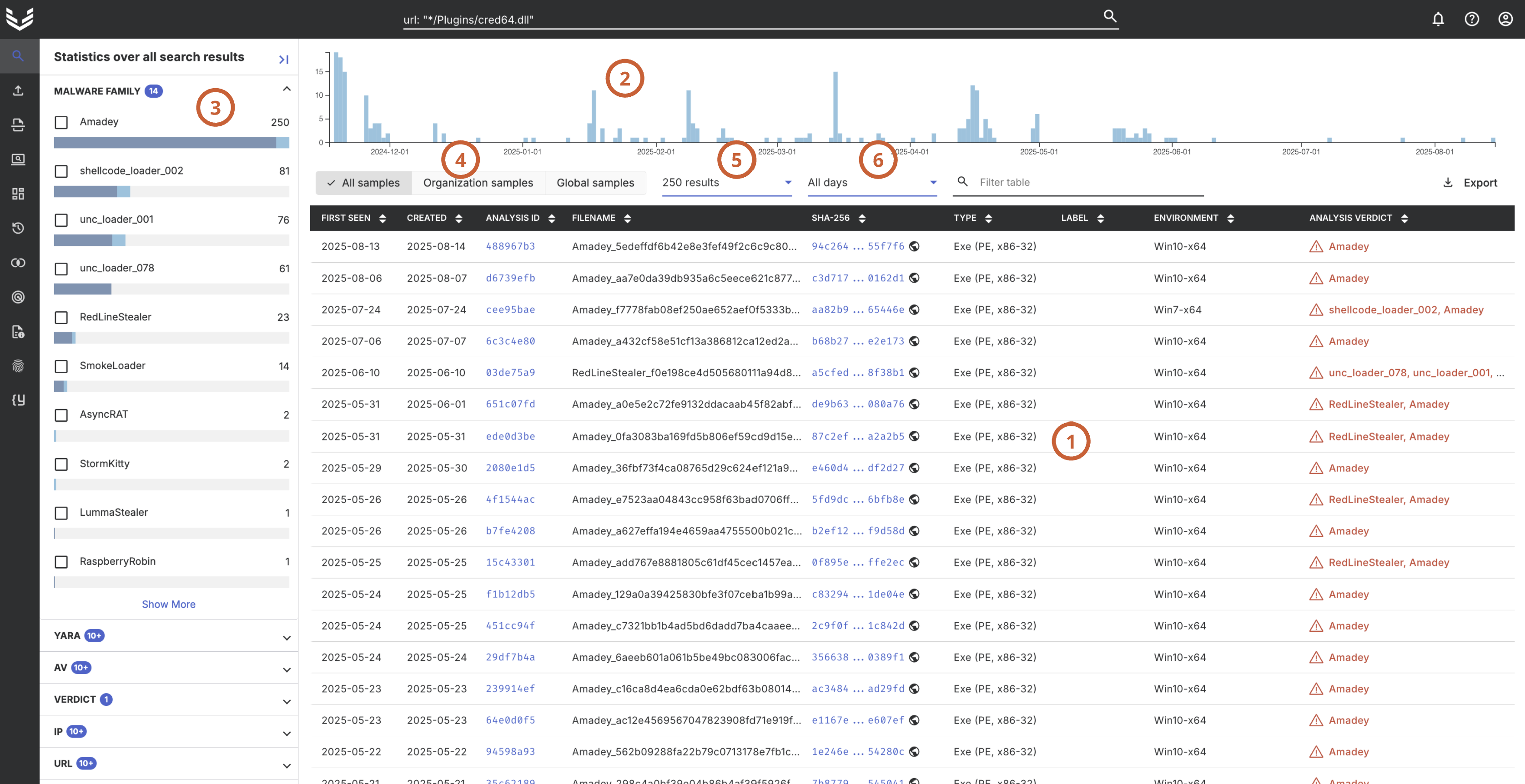 The list of matching sample analyses is displayed (1), ordered by the date the samples were first seen. For Retrohunts, the list is ordered by similarity score, with more details available here. There may be multiple analyses for the same sample. Each analysis can be opened by clicking its ID. The timeline above (2) shows the distribution of samples from the matching analyses based on their first seen timestamps. The left-hand side displays statistics (3) gathered from the matching analyses, including the malware family and behavioral artifacts, as described here. Clicking on any entry in the statistics will refine the search query by that term, allowing for more precise results.